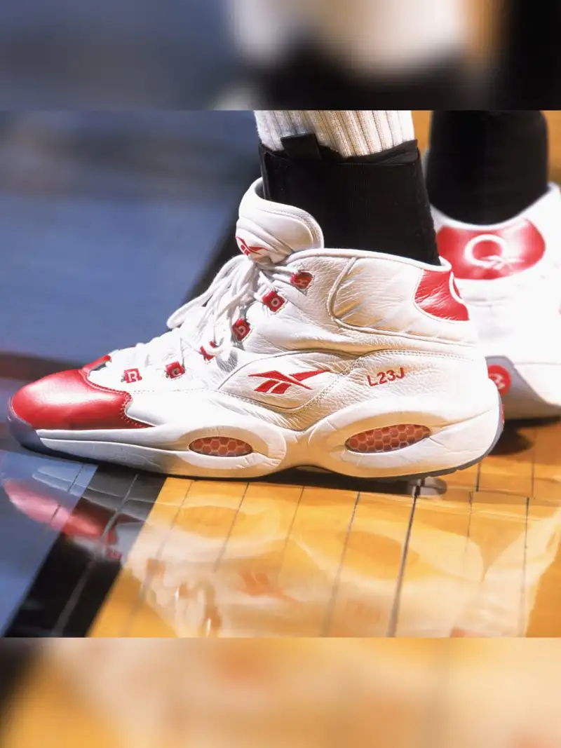 當(dāng)時(shí)的詹姆斯還未與耐克達(dá)成7年9000萬美元的超級(jí)球鞋代言合約,因此,詹姆斯腳下穿著著銳步為其定制的Reebok Question PE。
